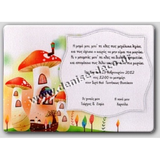 Προσκλητήριο τυπωμένο σε χαρτι κανσον 160 γρ, ενω εχουμε την δυνατοτητα να το τυπωσουμε και σε ρυζοχαρτο 100γρ ή περγαμηνη ιταλιας 160γρ. Επικοινωνηστε μαζι μας για οποιαδηποτε αλλαγη η δωστε δωστε μας το θεμα που επιθυμειτε για να το δημιουργησουμε για εσας.