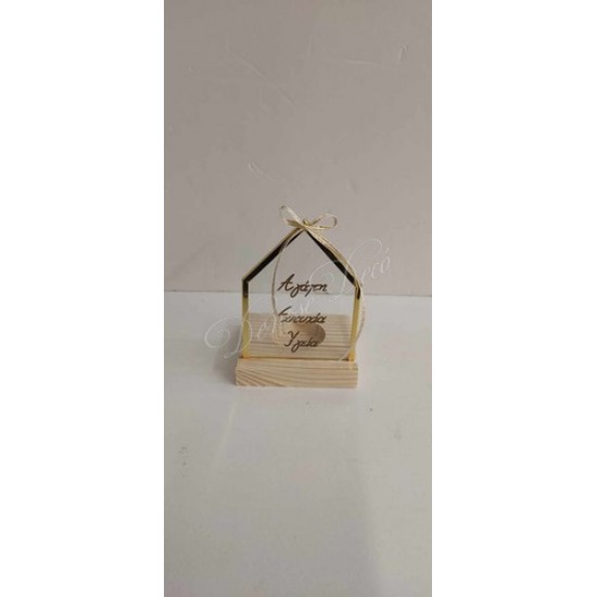 Μπομπονιερα με γυαλινο διακοσμητικο που αναγραφη ευχες σε ξυλινη βαση για ρεσω που περιλαμβανουν δεσιμο και κουφετα