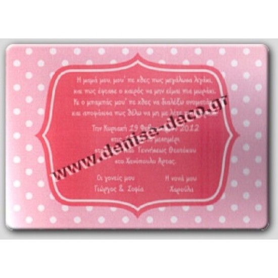 Προσκλητήριο τυπωμένο σε χαρτι κανσον 160 γρ, ενω εχουμε την δυνατοτητα να το τυπωσουμε και σε ρυζοχαρτο 100γρ ή περγαμηνη ιταλιας 160γρ. Επικοινωνηστε μαζι μας για οποιαδηποτε αλλαγη η δωστε δωστε μας το θεμα που επιθυμειτε για να το δημιουργησουμε για εσας.