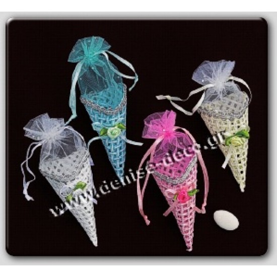 Ψαθινα χωνακια βαπτισης για μπομπονιερες σε τεσσερα χρωματα με εσωτερικο τουλι διακοσμητικο λουλουδακι και κορδελακι δεσιματος